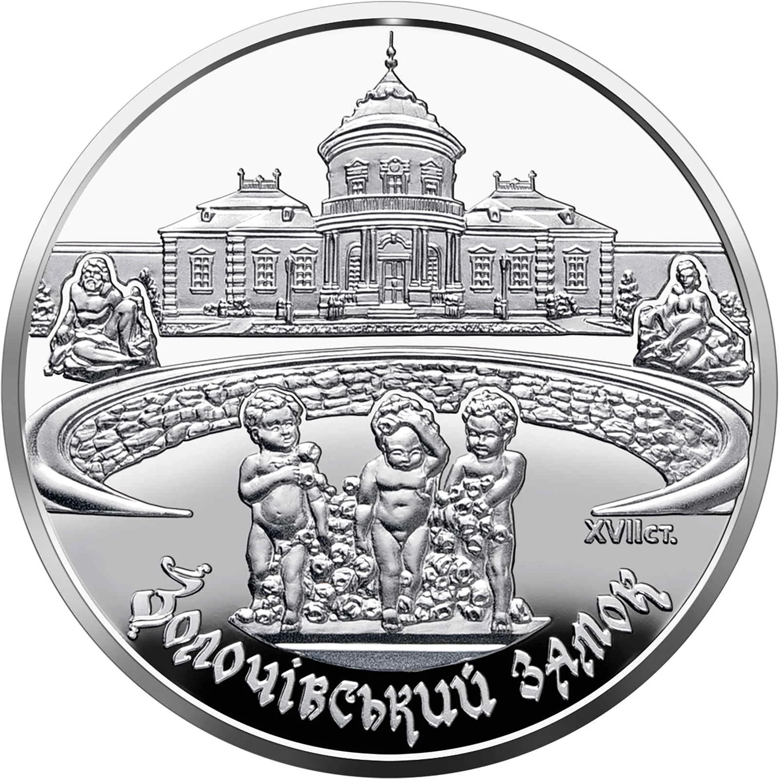 The castle courtyard features a fountain and a sculpture of three cupids. The Chinese Palace stands in the background, flanked by statues of Neptune (left) and Aphrodite (right). Legends: "ЗОЛОЧІВСЬКИЙ ЗАМОК" (below) and "XVIІ ст." (to the right).