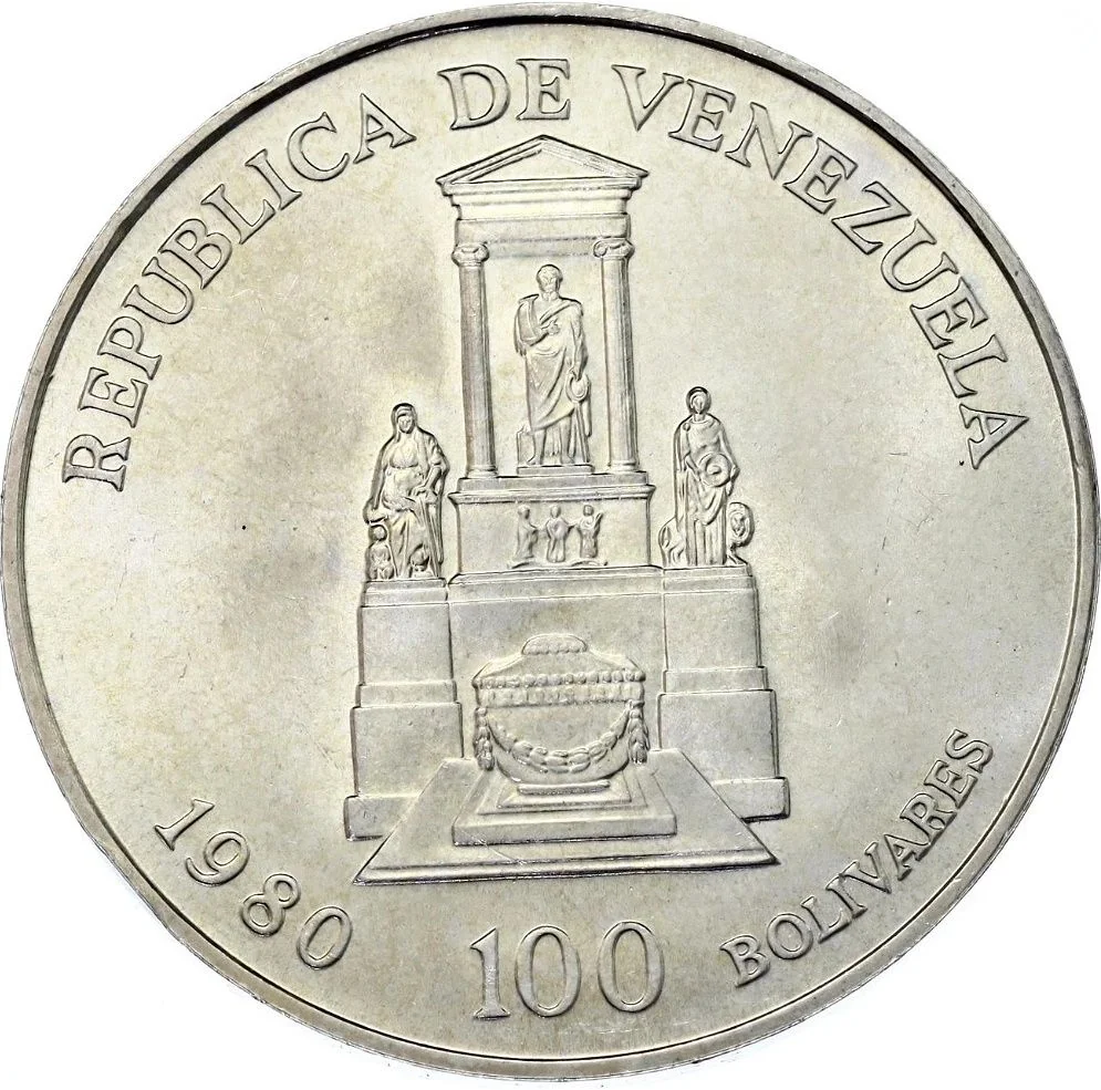 Circular rim, no beading. Center: Simón Bolívar's mausoleum from the National Pantheon in Caracas. Top: "REPÚBLICA DE VENEZUELA". Bottom: "1980" and "100 BOLÍVARES".