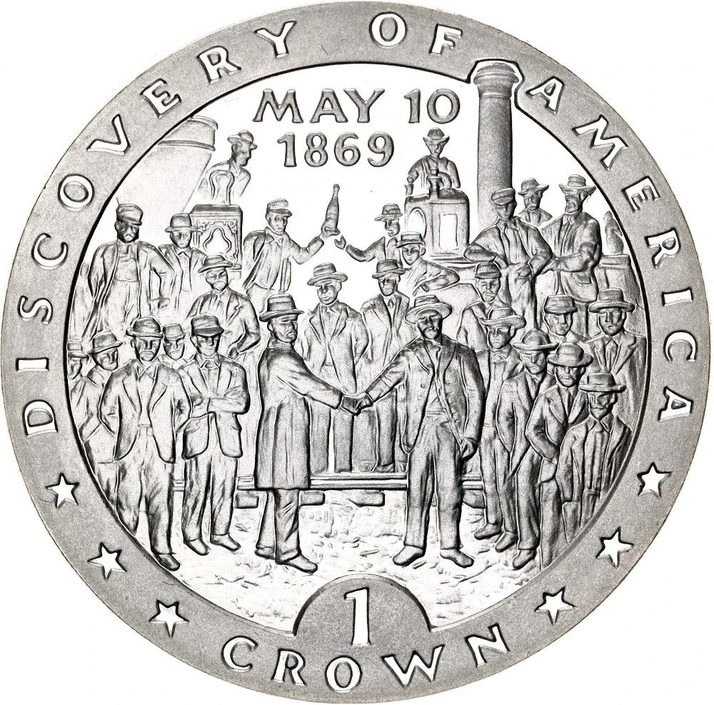 Golden Spike Ceremony, Promontory Summit, May 10, 1869, uniting the Union Pacific and Central Pacific railroads.