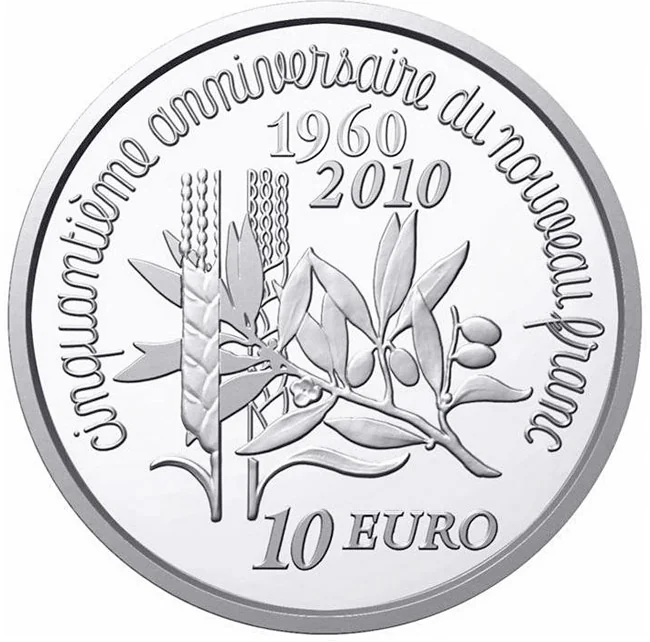A central olive branch and wheat ears, recalling the reverse of historic 1c-5 franc coins. The upper edge bears the inscription "fiftieth anniversary of the new franc," styled like the 1 centime, with the dates "1960 2010" marking the anniversary of the Franc Pinay/de Gaulle.