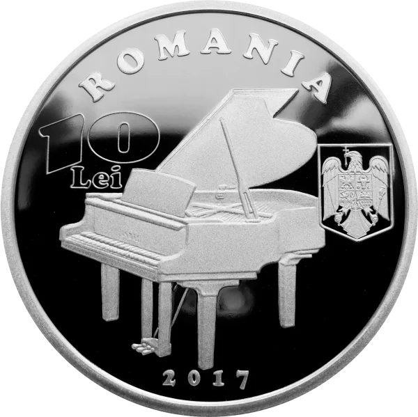 A piano, symbolizing Dinu Lipatti, with "ROMANIA" arched above, the Romanian coat of arms, face value "10 Lei," and issue year "2017."