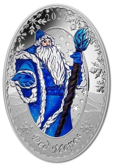 Father Frost stands with a crystalline staff, wearing a brilliant blue coat. Snowflakes encircle the image, finished with frosted textures.