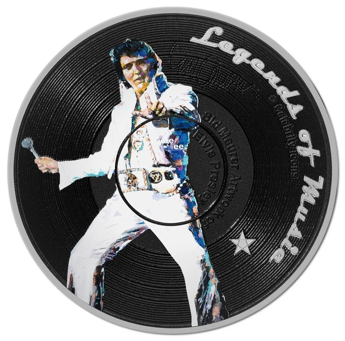 Maurer's Elvis Presley effigy captures the King in an iconic pose, gazing directly at the holder against a vinyl-record-inspired background.