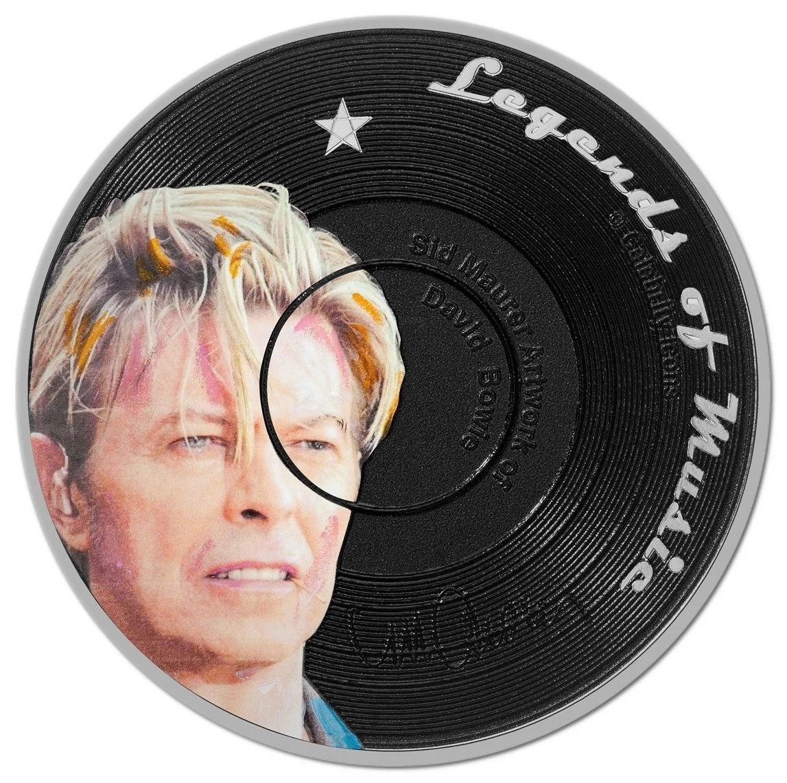 Sid Maurer's David Bowie portrait faces right, set against a black ruthenium vinyl record.