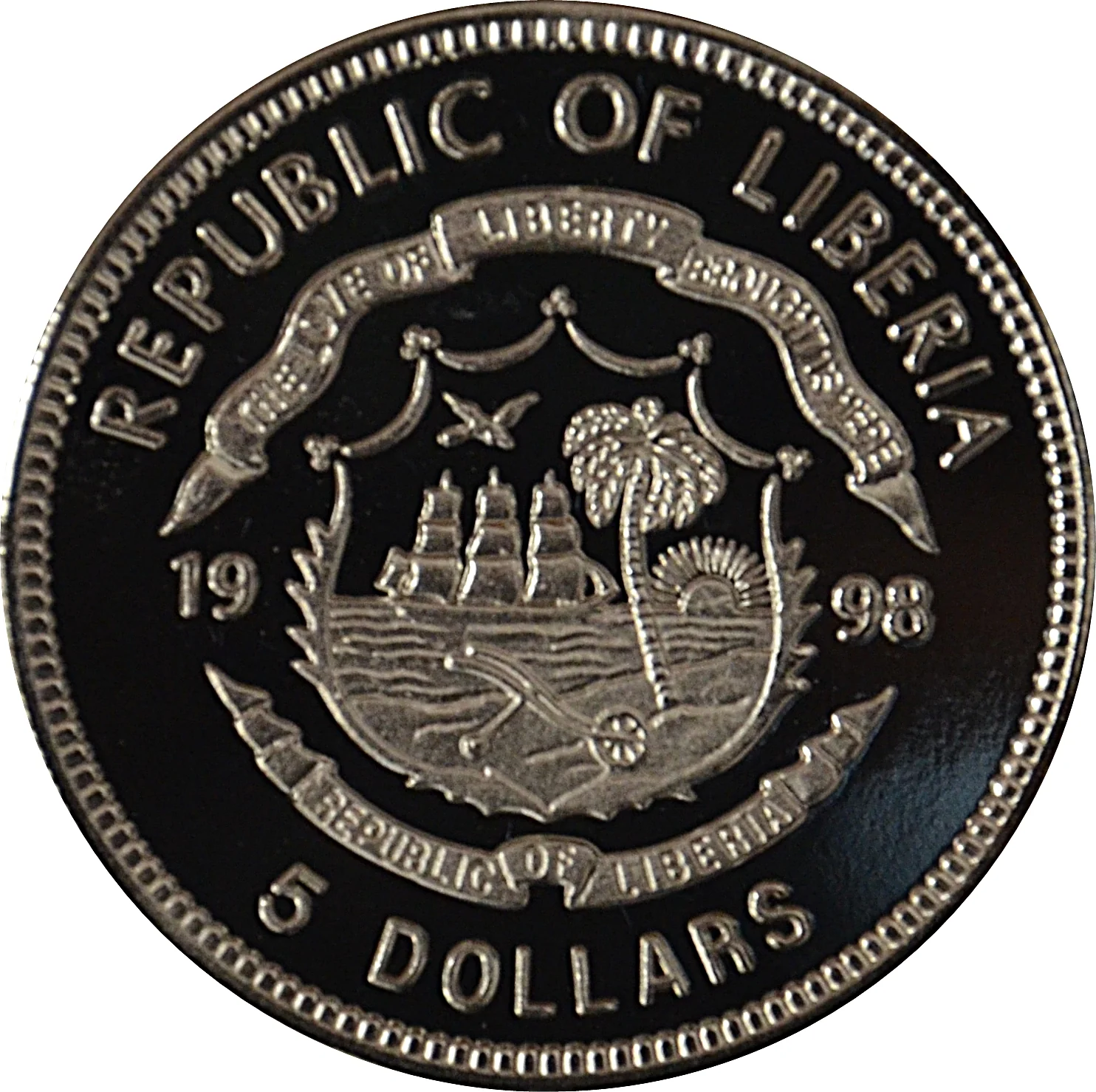 Liberian coat of arms divides date, denomination below.