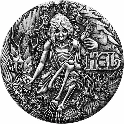 Hel, gaunt and enthroned, sits beside a tree whose roots cradle twisted skulls.