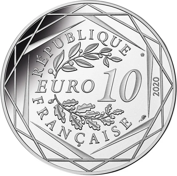 "10 EURO" flanked by laurel and oak branches, encircled by "RÉPUBLIQUE FRANÇAISE" and three hexagons.