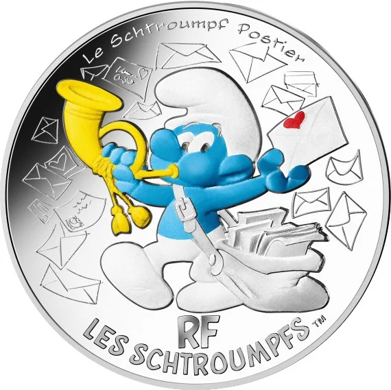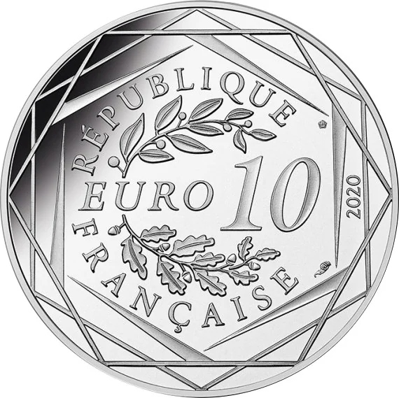"10 EURO" flanked by laurel and oak branches, encircled by "RÉPUBLIQUE FRANÇAISE" and three hexagons.