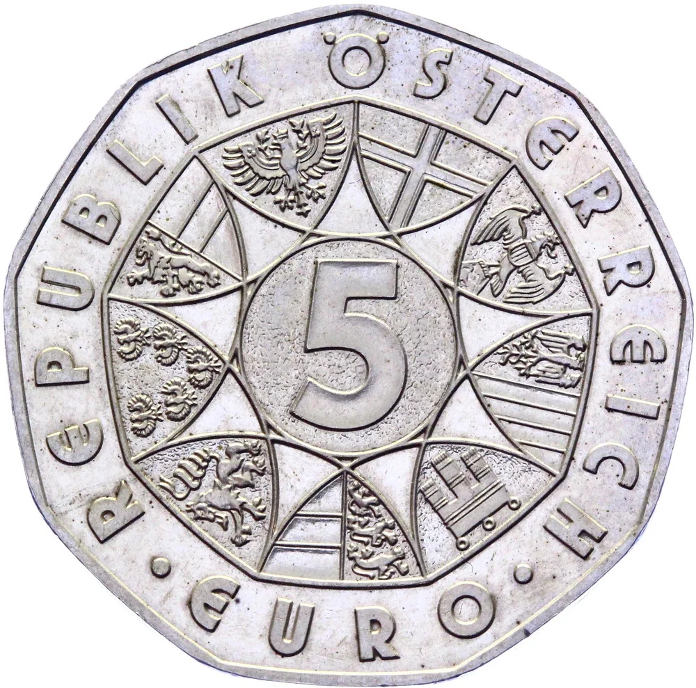 The design, inspired by Austria's old 50 schilling coins, features the "5 EURO" value encircled by the nine provincial coats of arms and the inscription "REPUBLIK ÖSTERREICH."