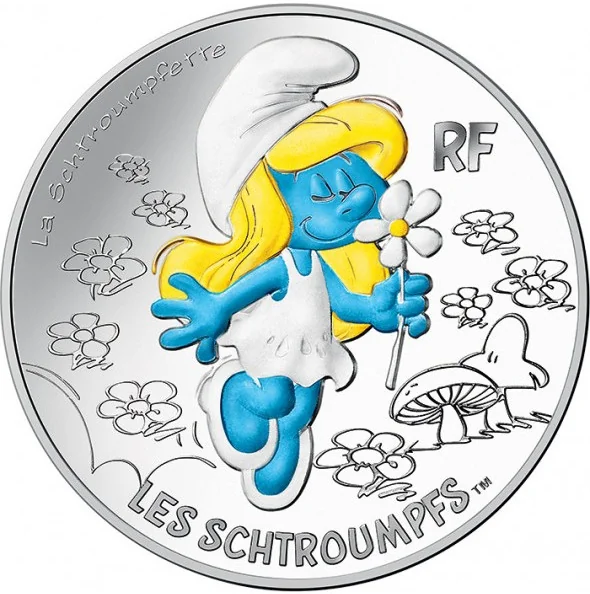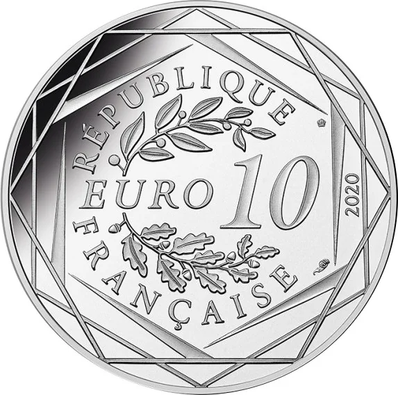 "10 EURO" flanked by laurel and oak branches, encircled by "RÉPUBLIQUE FRANÇAISE" and three hexagons.
