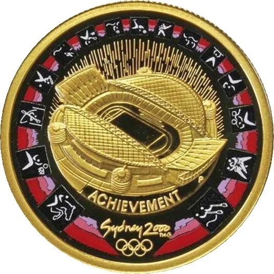 Aerial view of Sydney Olympic Stadium encircled by 15 red Olympic sports.