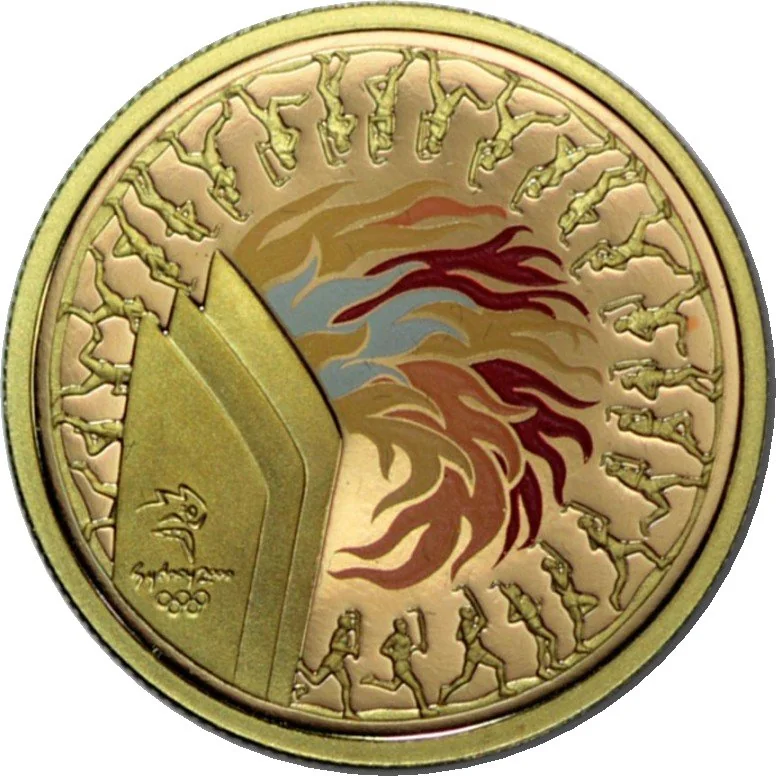 Colored Olympic torch with 25 tiny torchbearers around its rim. Sydney 2000 logo and Olympic rings at bottom left.