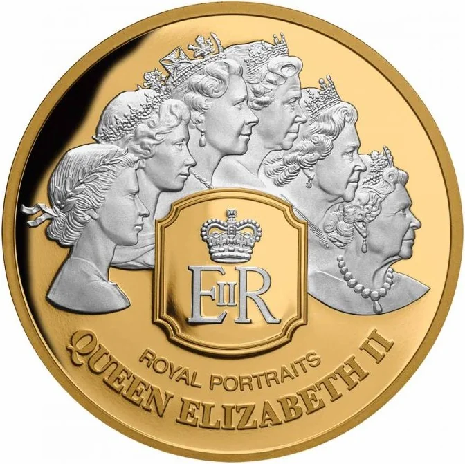 The six portraits of the Queen—by Gillick, Machin, Maklouf, Rank-Broadley, Gottwald, and Clark—are united with her Royal Cypher.