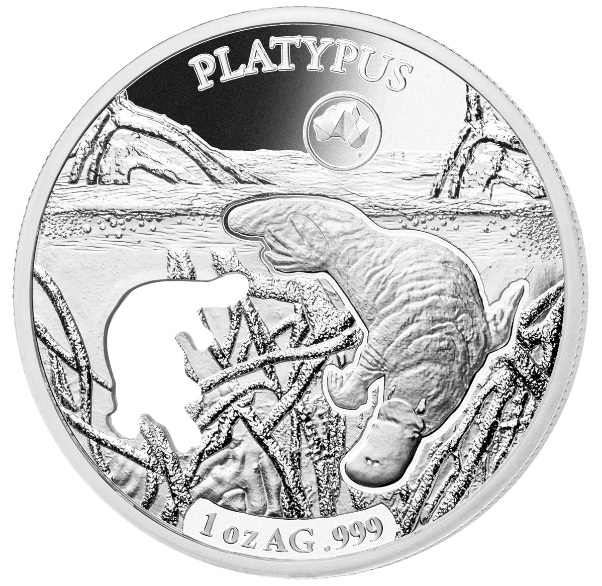 A platypus in its habitat, with a precise cut-out of its shape beside it.