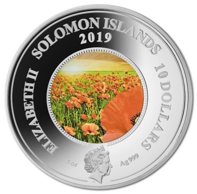 A vibrant glass poppy field adorns this coin, glowing against its luminous precious metal.