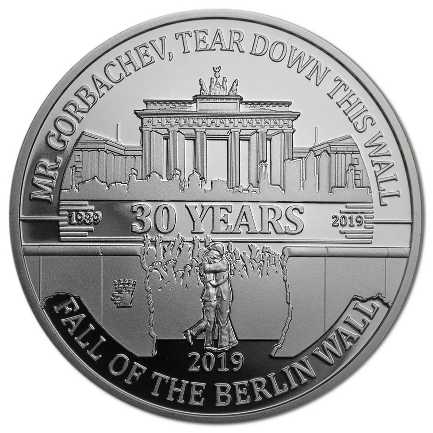 The Brandenburg Gate and a Berlin skyline above an embracing couple before a partially demolished wall, with the Berlin State Mint mark.