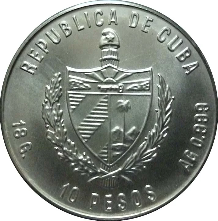 Cuban coat of arms with country name above, weight and finess on the sides, and face value below.