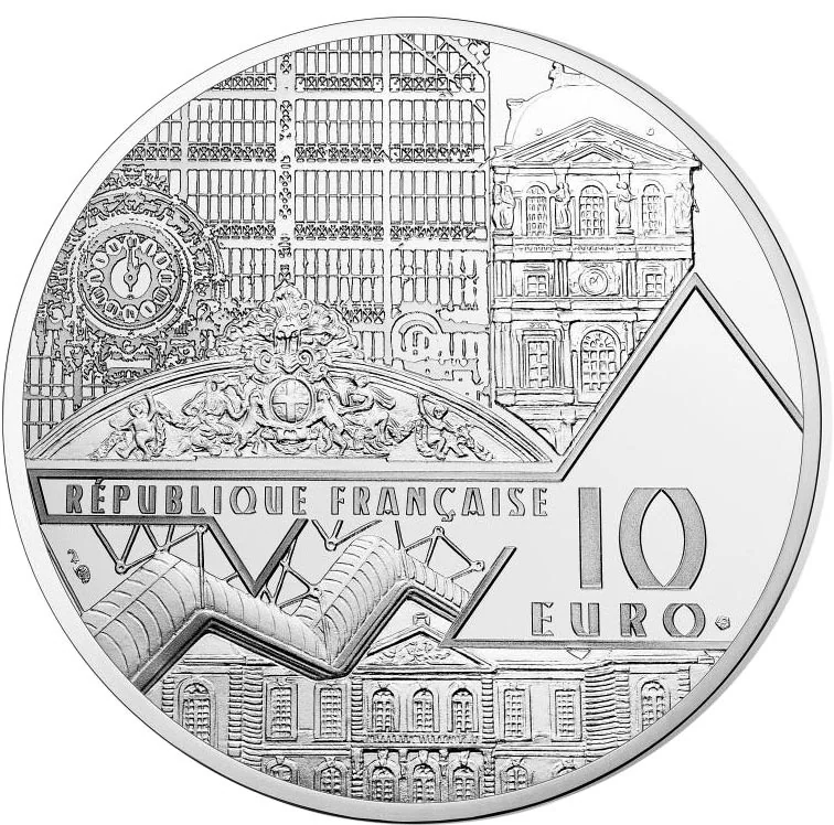 Major French museums: the Musée d'Orsay interior (top left), the Louvre's pyramid courtyard, the Musée Picasso (Hôtel Salé), the Musée Rodin (Hôtel Biron), and the Centre Pompidou staircase. Includes face value and "RÉPUBLIQUE FRANÇAISE."