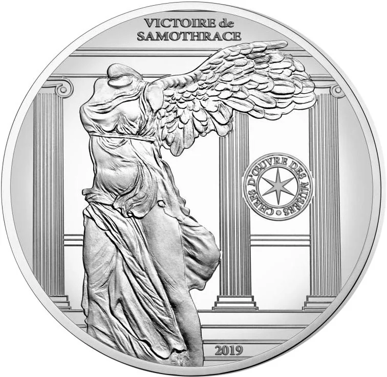 The reverse depicts the armless, winged statue of Niké, goddess of Victory. The background columns reference both her display in the Louvre and the Athenian Parthenon.