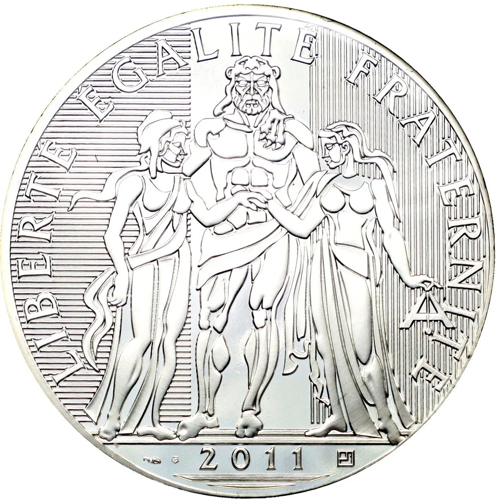 A nude Hercules wearing a lion skin stands frontally, uniting Liberty (left) and Equality (right, holding a level). A stylized French flag is behind them, surrounded by the motto "LIBERTÉ ÉGALITÉ FRATERNITÉ". The design modernizes Dupré's Hercules, recalling old French Republic coins.