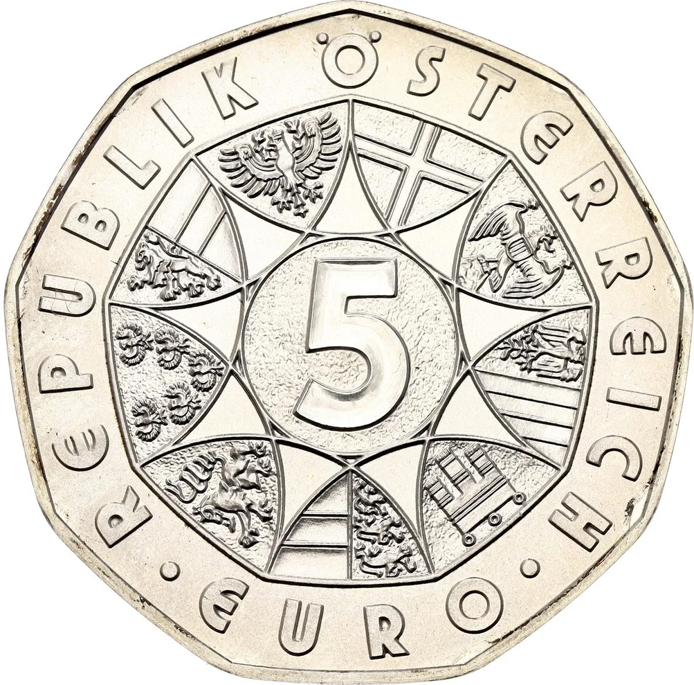 The design, inspired by Austria's old 50 schilling coins, features the "5 EURO" value encircled by the nine provincial coats of arms and the inscription "REPUBLIK ÖSTERREICH."