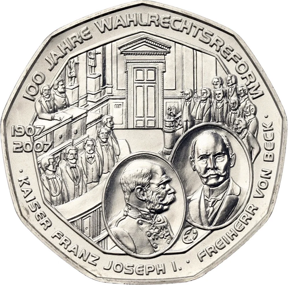 Inspired by a historic photo of Parliament’s 1907 opening session, this design shows the government bench with officials above and new members opposite. Oval portraits honor Emperor Franz Joseph and Max von Beck, key figures in the reform. Caption: “100 years voting rights reform,” “1907 2007,” “Emperor Franz Joseph I / Baron Von Beck.”