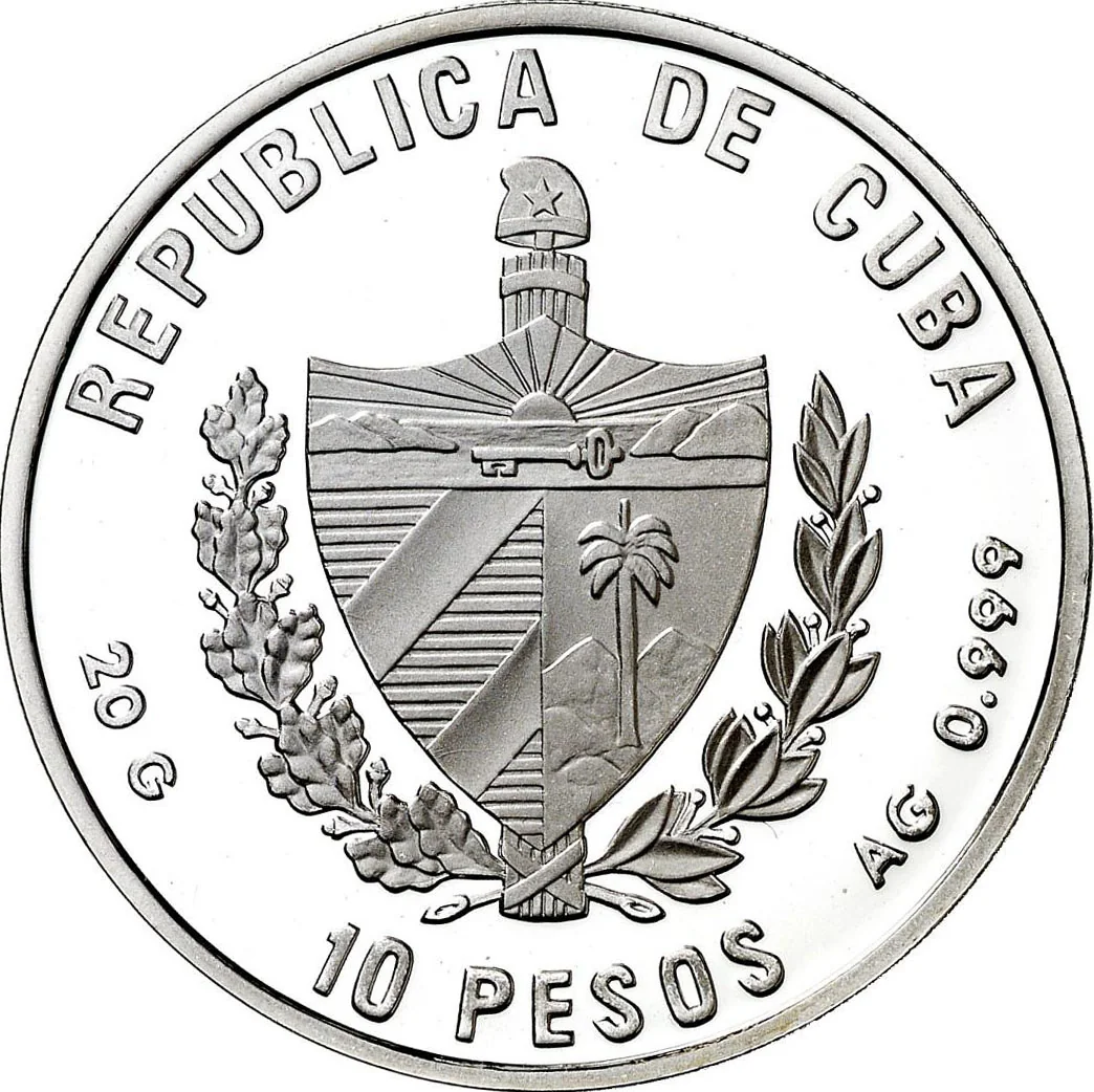 Cuban coat of arms with curved country name above, face value below, and weight and fineness on the sides.