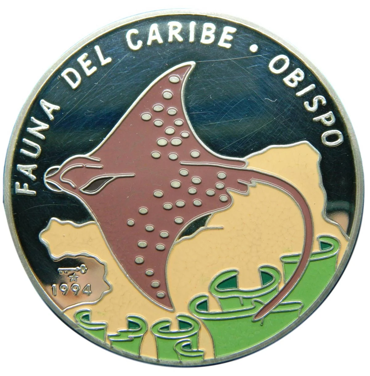 Spotted Eagle Ray left, curved legend above, date and mintmark lower left.