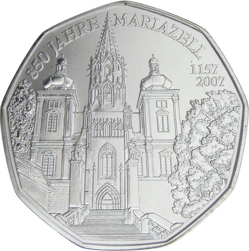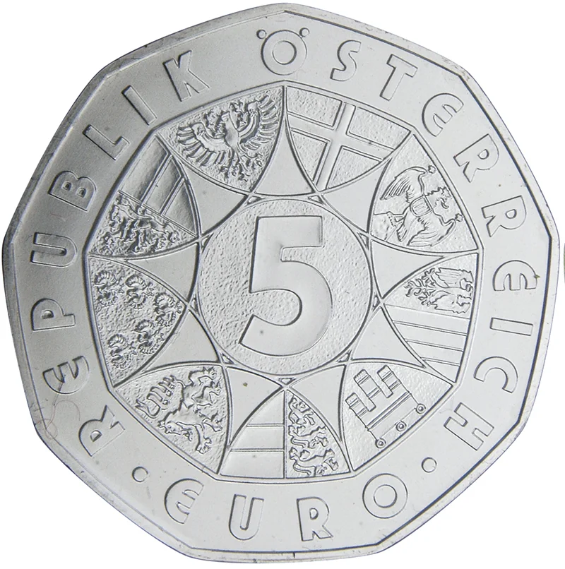 The design, inspired by Austria's old 50 schilling coins, features the "5 EURO" value encircled by the nine provincial coats of arms and the inscription "REPUBLIK ÖSTERREICH."