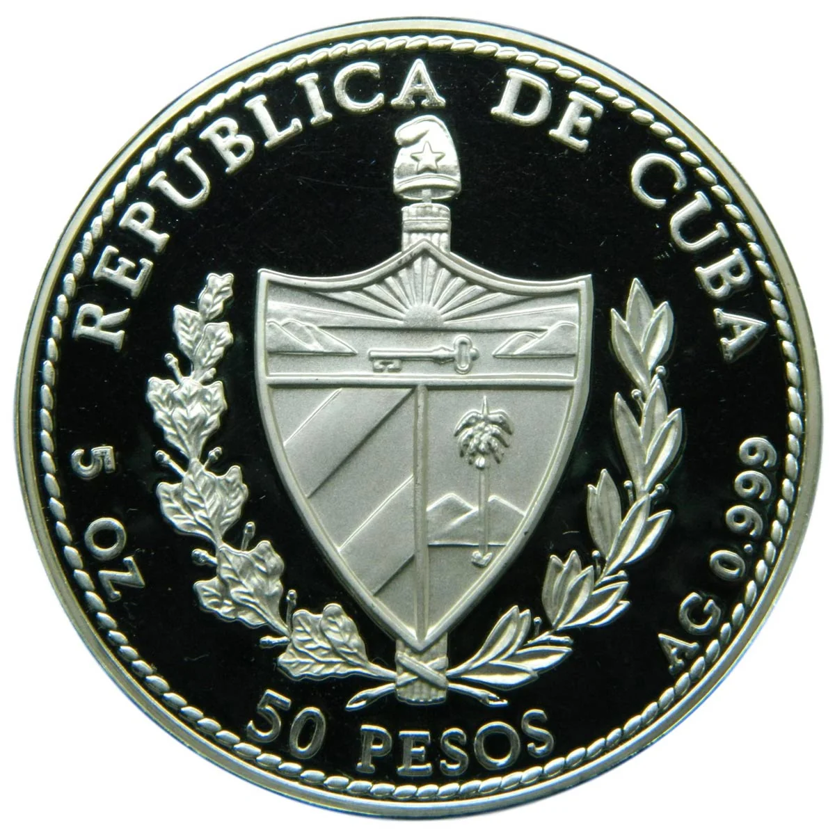 Cuban coat of arms with country name above, face value below, and fineness and weight on the sides.