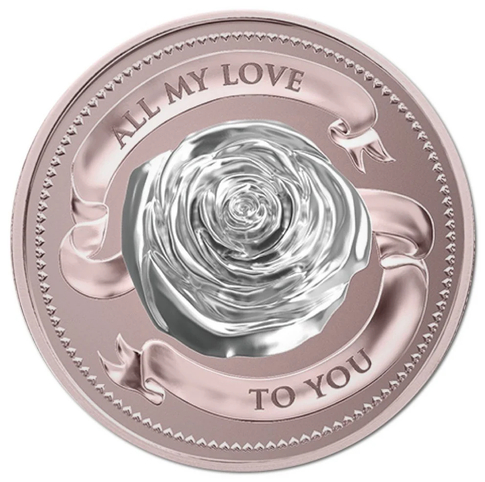 With a rose-pink blush, the coin base complements the insert's silver petals.