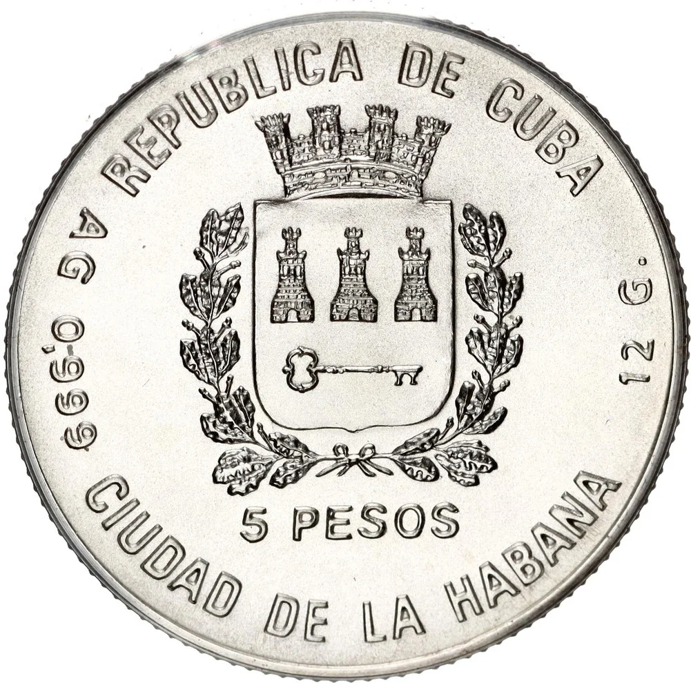 Havana City coat of arms, country name above, face value below, city name beneath; fineness and weight on sides.