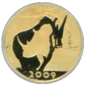Rhinoceros in outline, left three-quarter view, in a field. "2009" below.