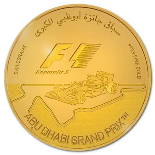 Description: This coin commemorates the ABU DHABI GRAND PRIX™, featuring the F1® logo, the event's name in English and Arabic, a detailed 2016 F1® car, and a depiction of the circuit.