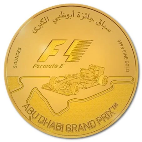 Description: This coin commemorates the ABU DHABI GRAND PRIX™, featuring the F1® logo, the event's name in English and Arabic, a detailed 2016 F1® car, and a depiction of the circuit.