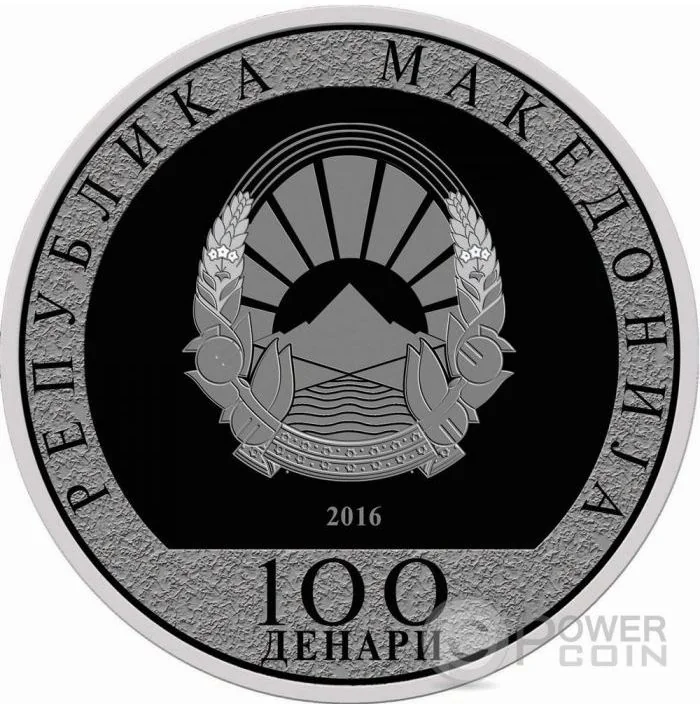 The center features Macedonia's coat of arms and "2016," surrounded by the inscriptions "Republic of Macedonia" and "100 Denars."