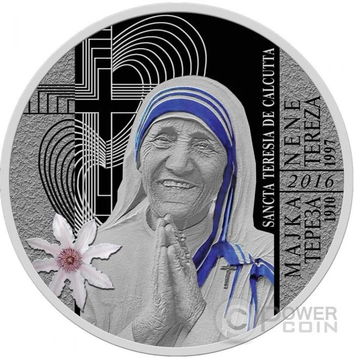 The coin features a central portrait of Mother Teresa. To the left are cross and heart ornaments, along with a clematis flower "Matka Teresa" bred by Stefan Franczak. On the right are the dates 1910-1997 and 2016, and her name in Latin, Macedonian, and Albanian.