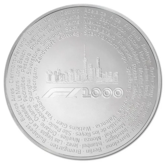 The F1 1000 logo, Shanghai's skyline, and the names of every host city since 1950.