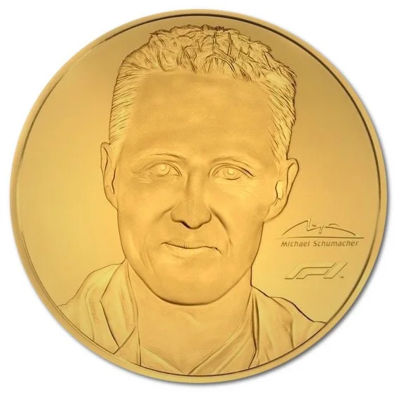 Iconic portrait of Michael Schumacher with his signature and the F1 logo.