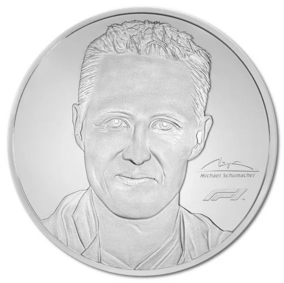 Iconic portrait of Michael Schumacher with his signature and the F1 logo.