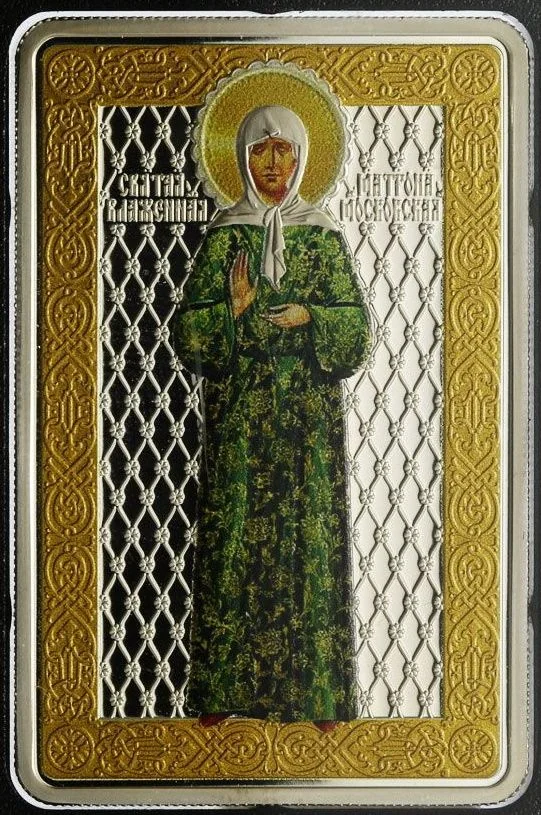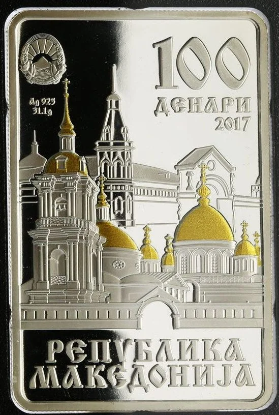 Description: The obverse features the Republic of Macedonia's coat of arms, "100 Denars," and "2017," along with "Ag 925" and "31.1g." The central design shows a section of Moscow's Pokrovsky Monastery, housing St. Matrona's relics, with the monastery outlined behind it. At the bottom is "Republic of Macedonia."