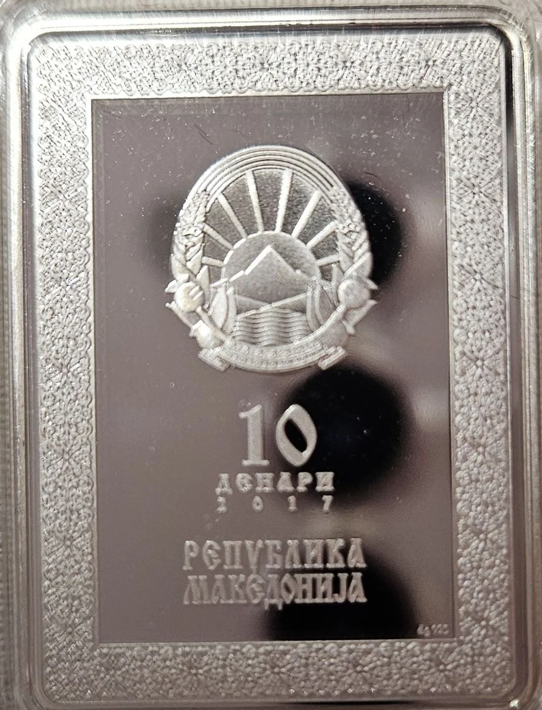 The obverse features Macedonia's coat of arms, surrounded by a perimeter ornament, with inscriptions for "10 Denars," "Republic of Macedonia," and the year "2017."