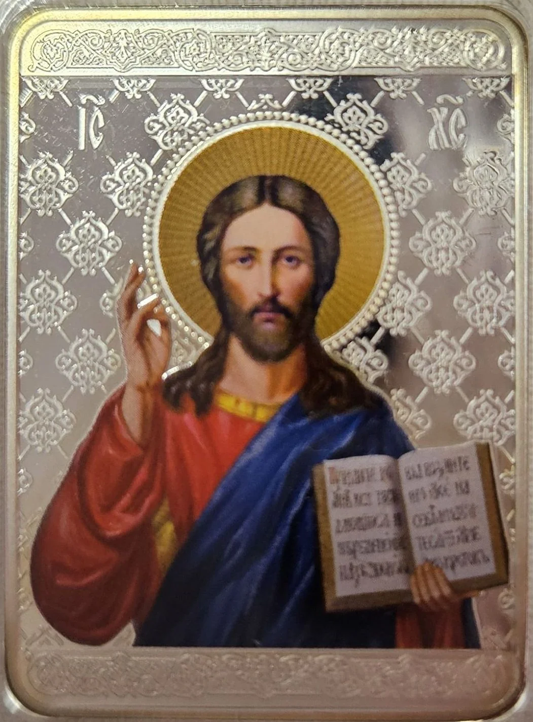 The reverse features a central portrait of Jesus Christ against an ornamental background, with his traditional iconic name inscribed above.