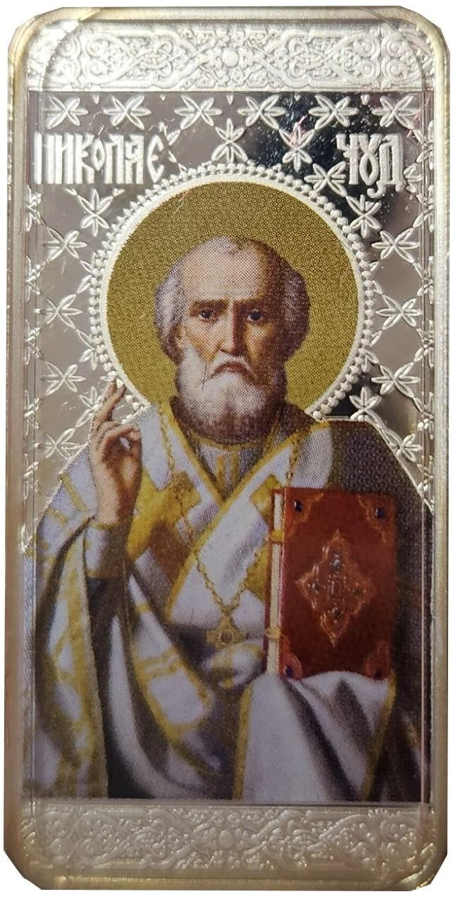 The reverse features a central portrait of St. Nicholas the Wonderworker against an ornamental background, with his traditional iconographic name inscribed above.
