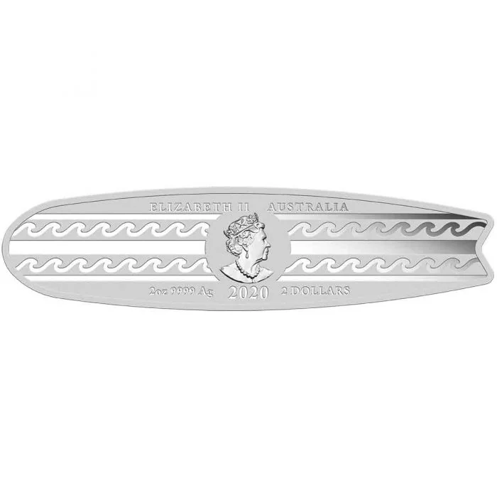 Queen Elizabeth II's crowned portrait facing right, wearing the George IV State Diadem and Victorian Coronation Necklace, centered on a surfboard with wave patterns.