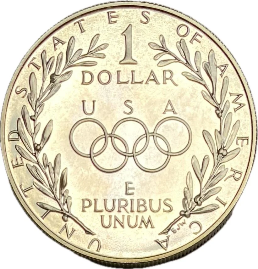 USA above the Olympic rings, framed by olive branches.