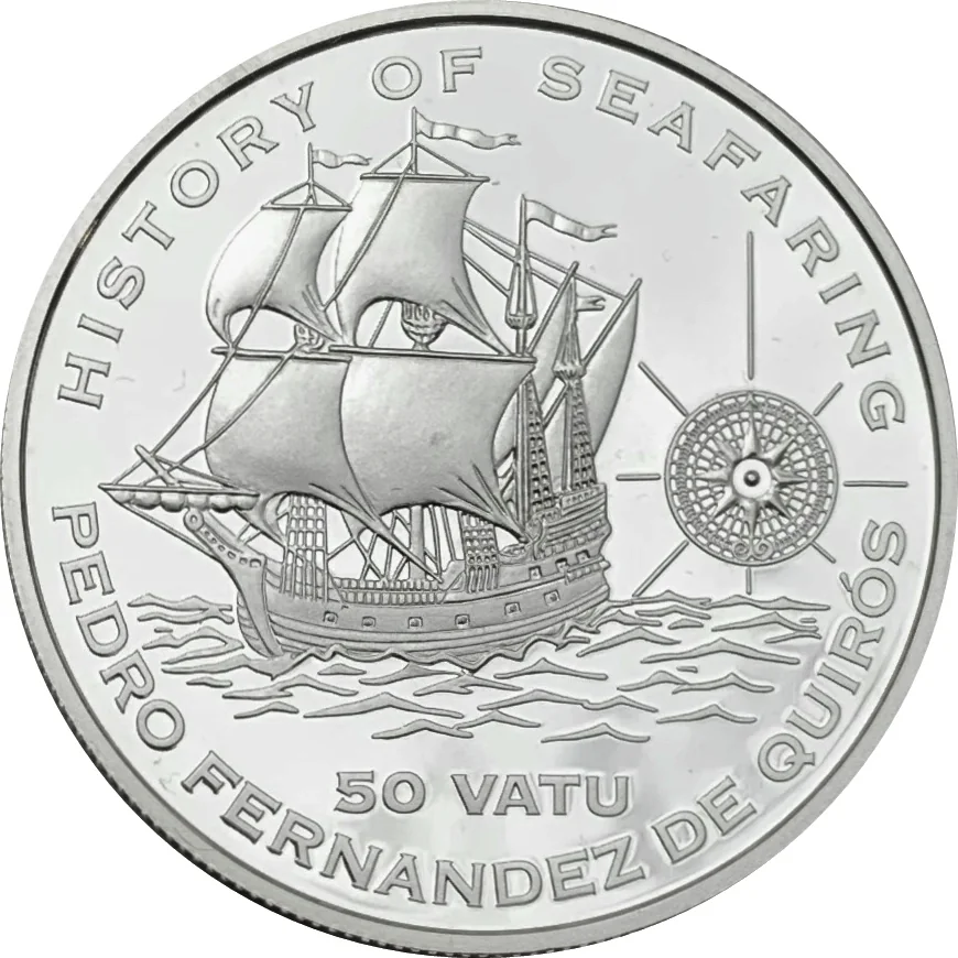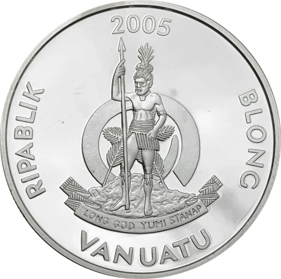Vanuatu's arms depict a Melanesian warrior before a curved boar's tooth, a scroll reading "LONG GOD YUMI STANAP," and the date.