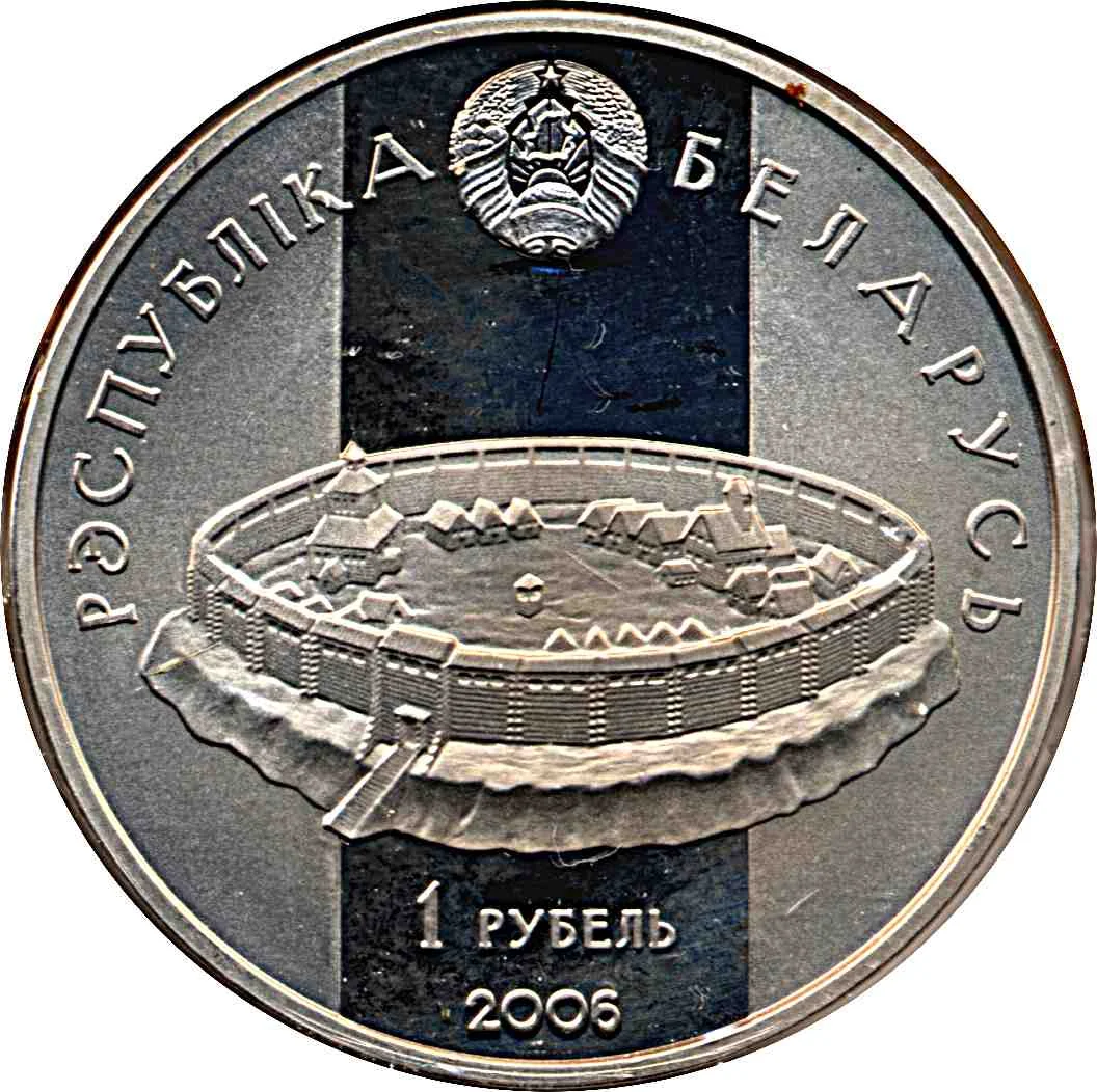 Description: Center: reconstruction of the ancient fortress in Izyaslavl from Rogneda's era. Top: relief of the Belarusian national coat of arms. Rim inscription: "РЭСПУБЛІКА БЕЛАРУСЬ". Bottom: year of issue and face value "1 РУБЕЛЬ".