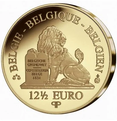 Belgium's lion symbol rests a paw on the "1831 CONSTITUTION," above the value, with the trilingual country name "BELGIE - BELGIQUE - BELGIEN."