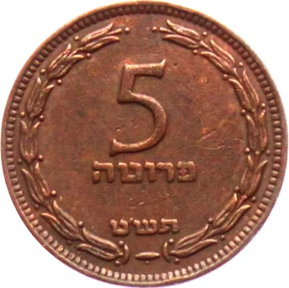 "5 Pruta" and Hebrew date within stylized olive branches.